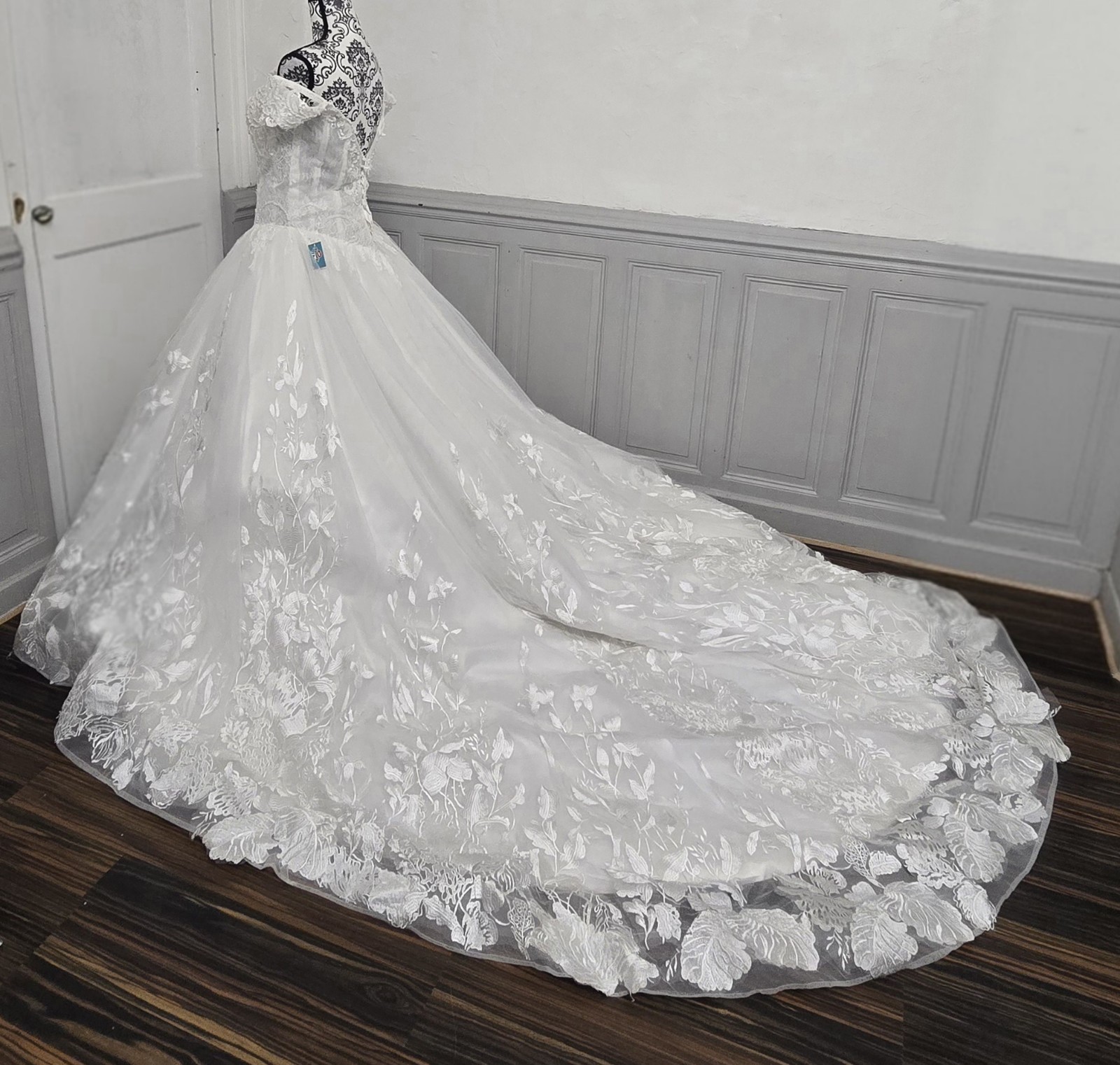 La jupe est large et volumineuse, décorée de broderies florales qui descendent jusqu’à la traîne. Robe de mariée blanche avec un décolleté épaules dénudées col bateau.