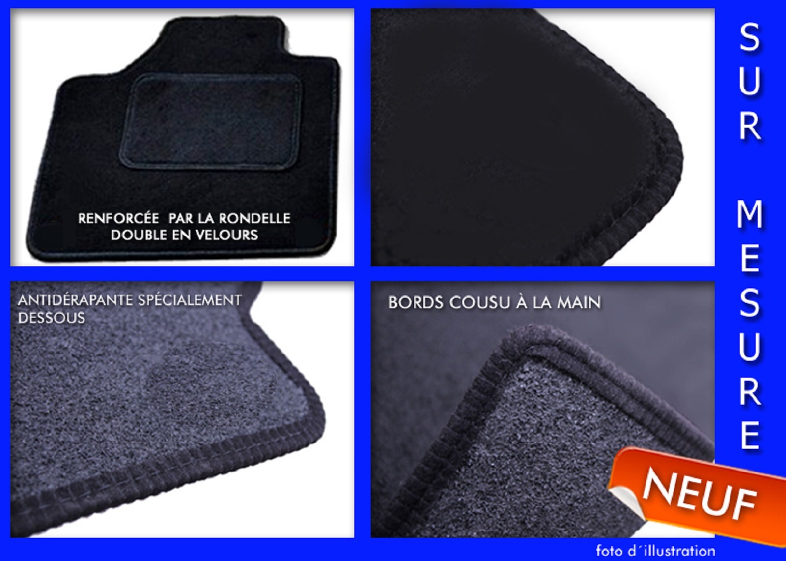 Les tapis de sol sont destinés pour l'utilisation dans les voitures personnelles ainsi que utilitaires. Les tapis de sol consistent en deux couches. La couche supérieure fibreuse en velours et la couche dessous qui est imperméable et antidérapante.
