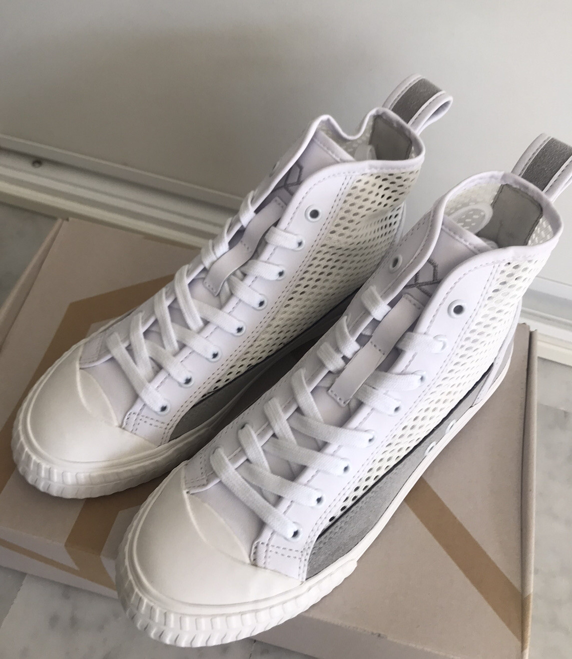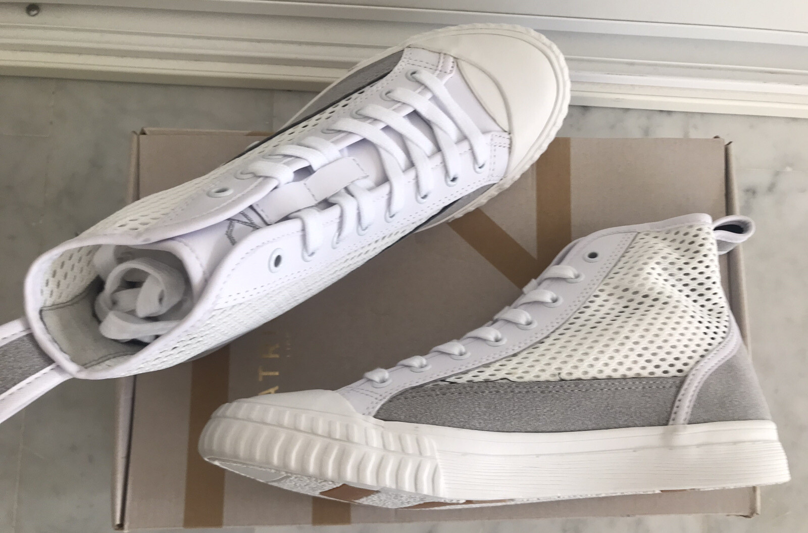 Baskets montantes parties alternées cuir nubuck et maille filet blanc et gris fermeture à lacets sneakers PATRIOTIC 37. Originales et tendances Leur + : les empiècements latéraux effets maille filet par lesquels on peut donner un style différent à chaque fois grâce à la couleur des chaussettes visibles au travers Valeur 100 euros Jamais portées Très grand tri dans les armoires Regroupez vos achats je recalcule les frais d’envoi Je vends les mêmes en blanc et bleu nuit (38 et portées)