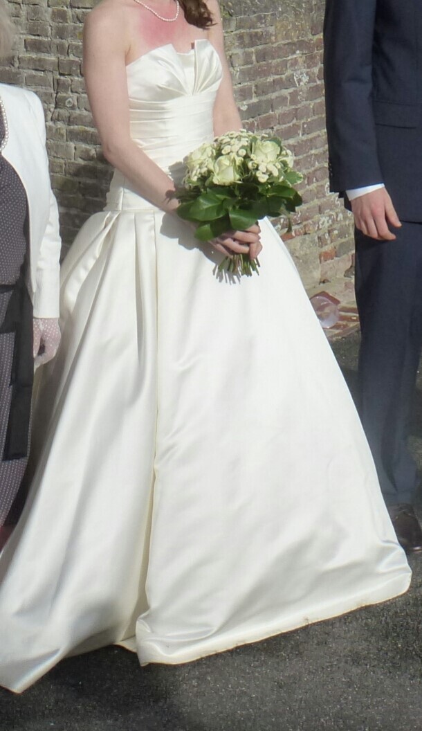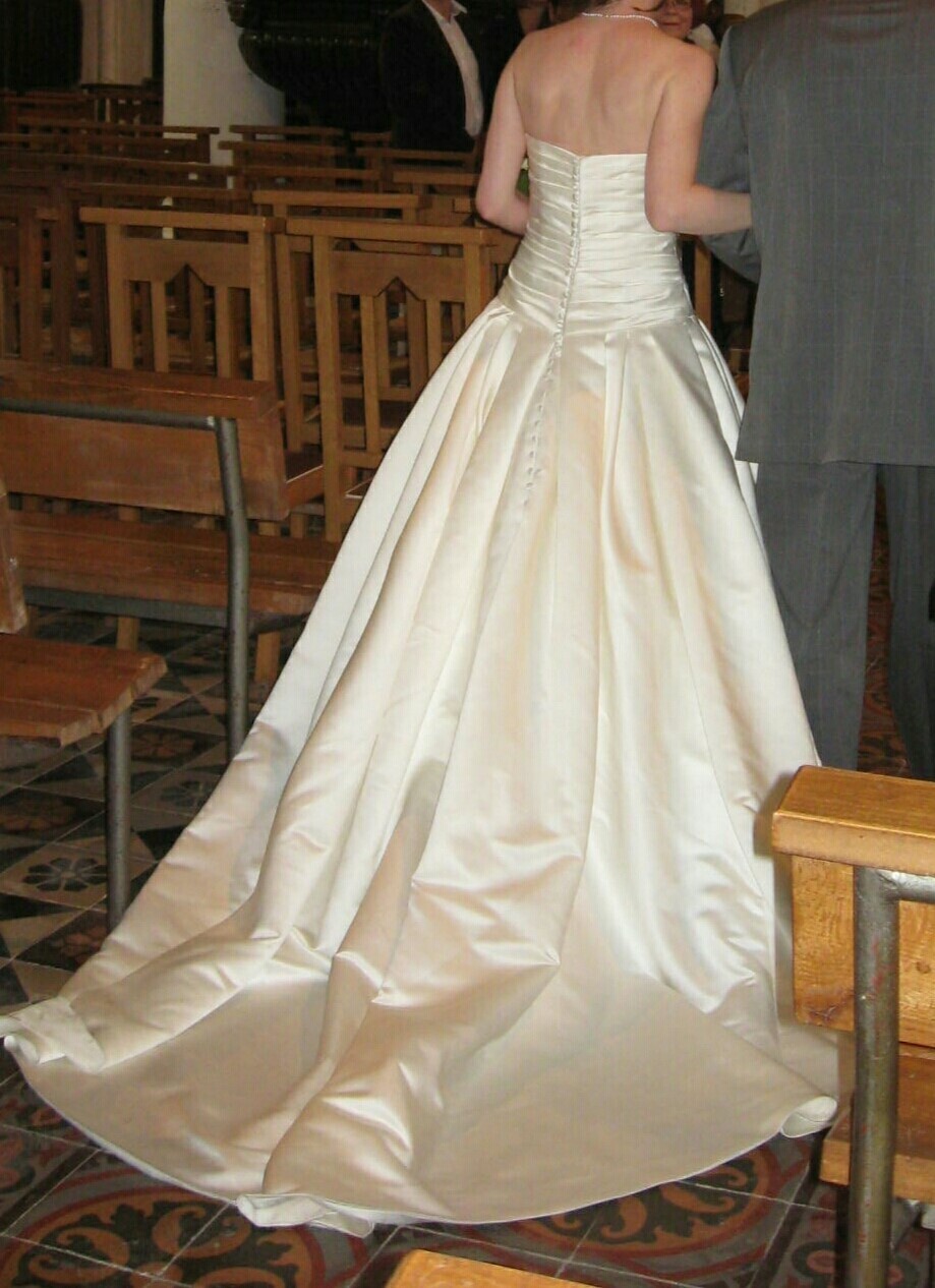 Robe de mariée de coupe princesse en satin à bustier et sans manches. Pressing après la cérémonie.