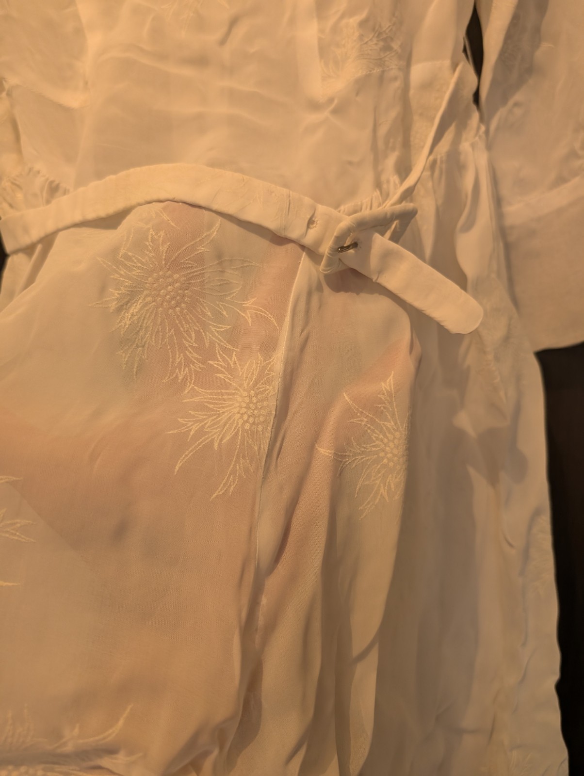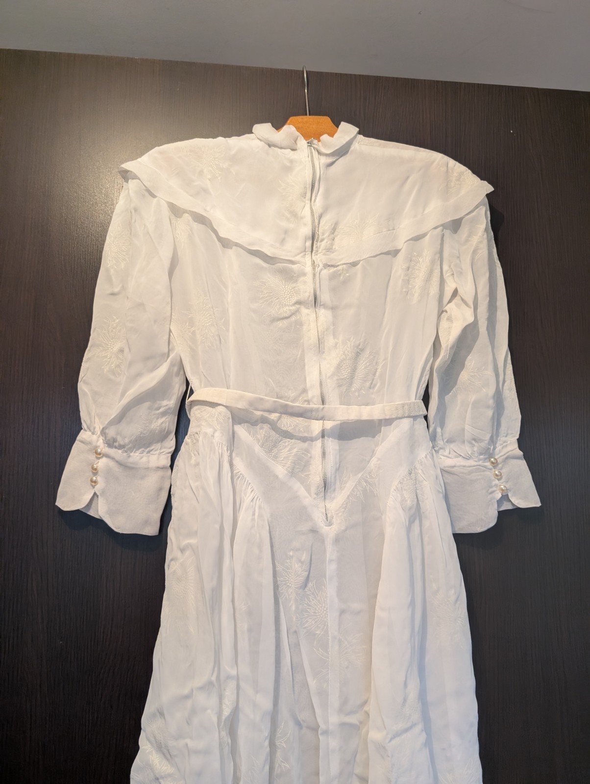 Avec sa ceinture et sa couronne (possibilité de manque de quelques perles ). Bon état ( 4 ou 5 petites tâches au bas de la robe, sans gravité ). Tissus voile transparent et brodé de fleurs.