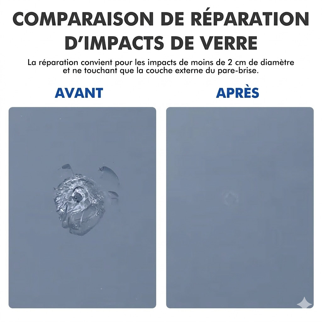 Réparation pare-brise, kit impact gravillon, résine pare-brise, stop fissure, carglass alternative, entretien voiture, accessoire auto, contrôle technique, éclat vitre, réparation éclat. Kit Réparation Pare-Brise Pro – Stop Impacts & Fissures – Résine Haute Pénétration.