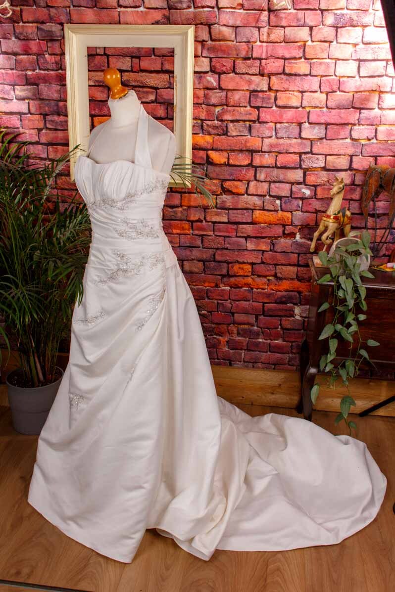 robe de mariée romantique en satin (duchesse) mat et chatoyant blanc crème discrètement décoré de perles et de dentelle, dos nu, fermeture éclair dans le dos.